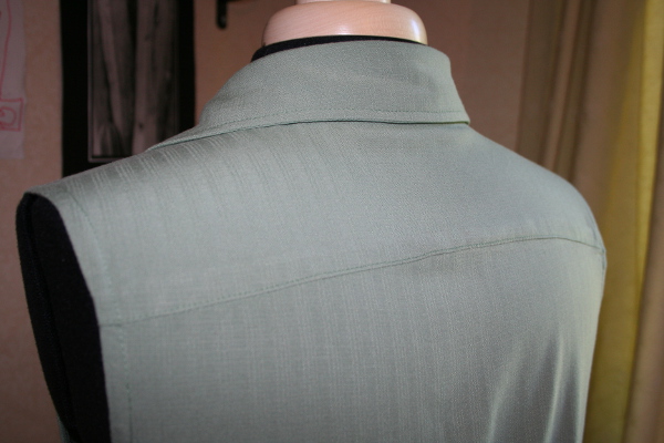 J’ai bien aimé dans ce modèle l’empiècement du dos et la couture des épaules déplacées vers l’avant. J’ai fait des surpiqûres pour marquer les coutures.