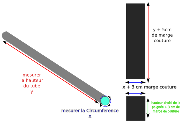Parlons couture… La taille de pièce du tissu va dépendre de votre tube. On trouve des tubes en carton avec le papier cadeau par exemple. Je vous ai fait un petit croquis.